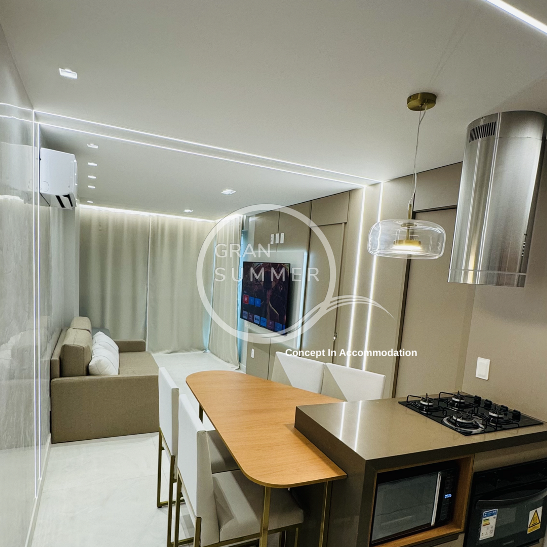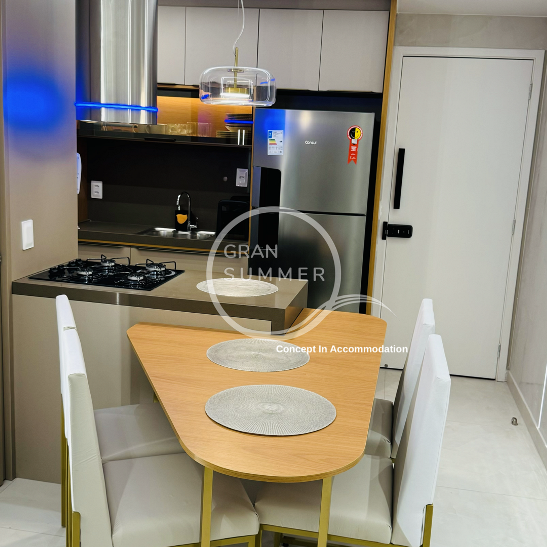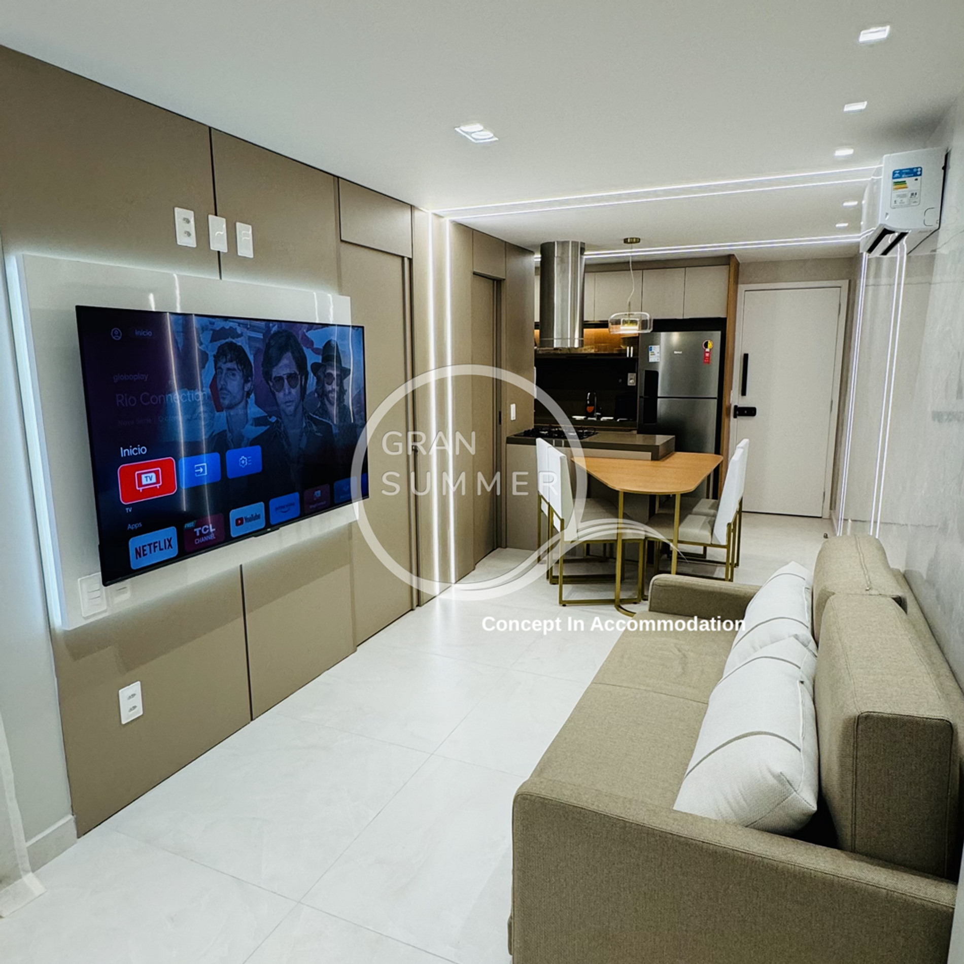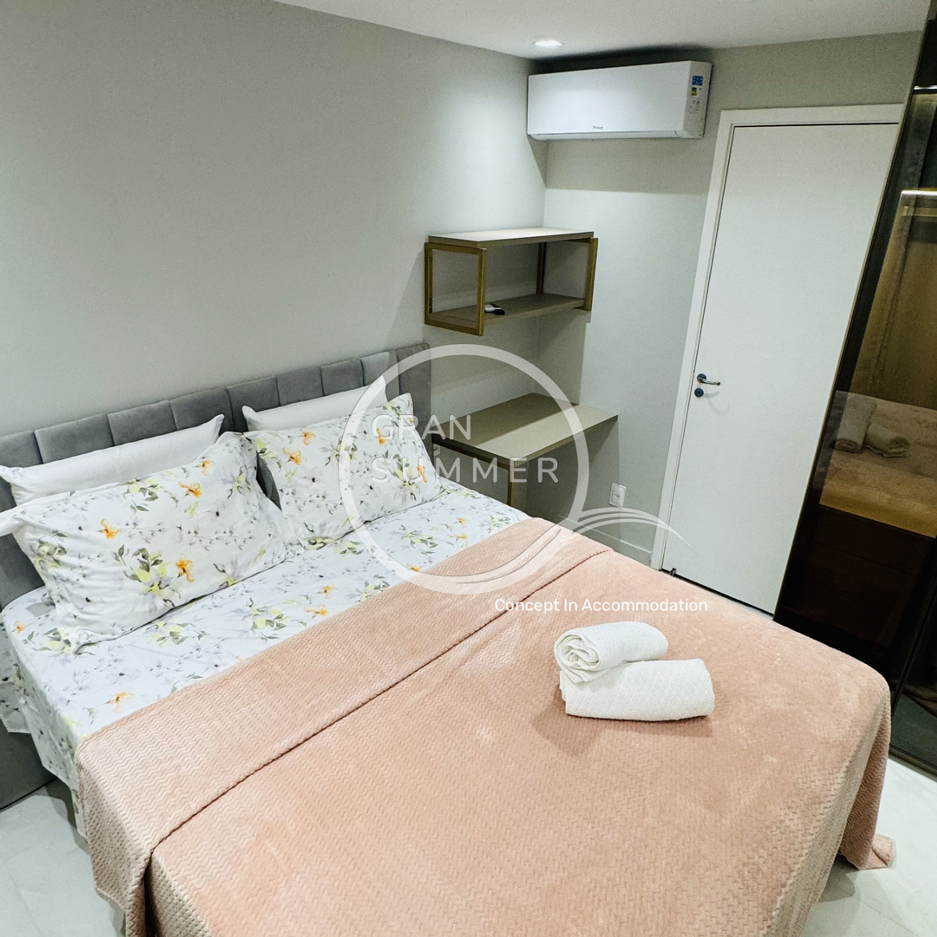 Apartamento completo, equipado com cozinha e utensílios,01 QUARTO, 01 cama de casal, armário para roupa, 02 centrais de ar condicionado, espaço para refeições,01 banheiro, lençóis 400 fios para maior conforto na hora do descanso dos nossos hóspedes, nossas Smart tv's com qualidade 4K e telas 43'' e 65'', 01 sofá-cama, 01 geladeira, 01 fogão, 1 micro-ondas, armários de cozinha, mercadinho 24h. Acomoda até 04 pessoas.