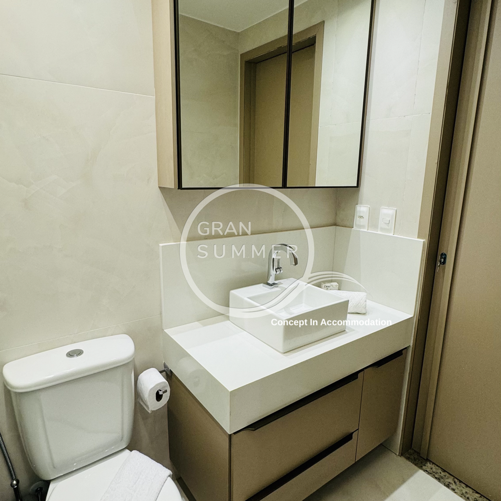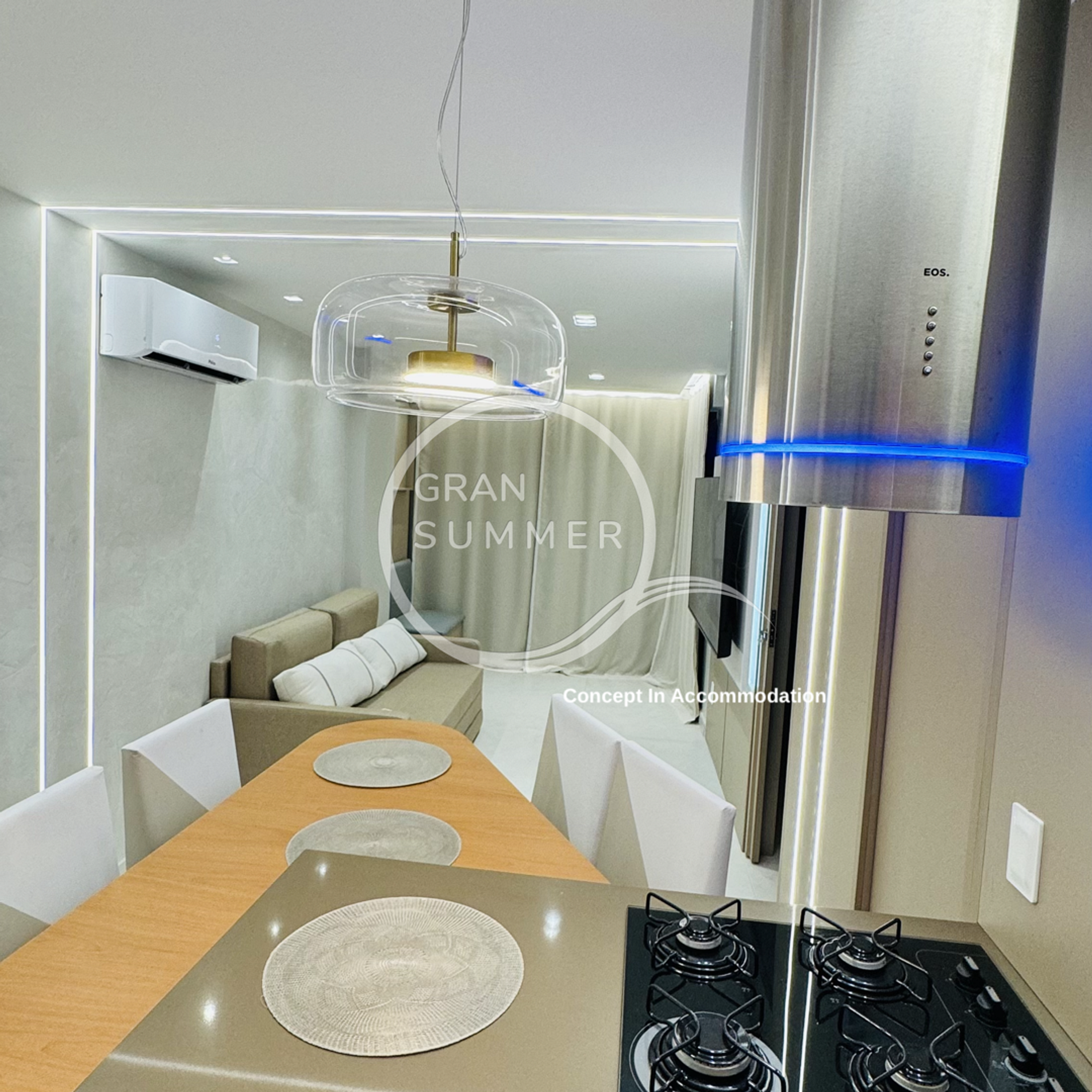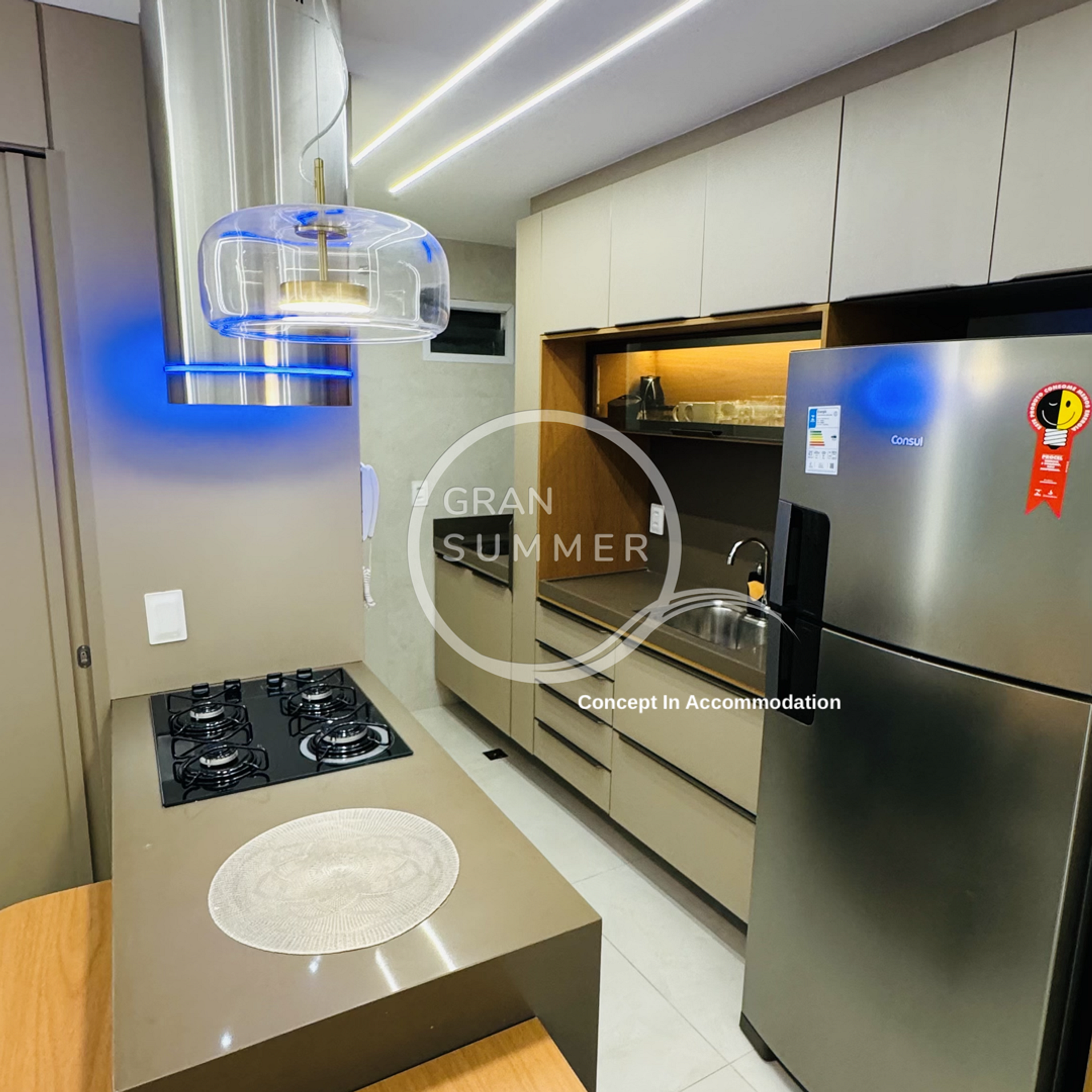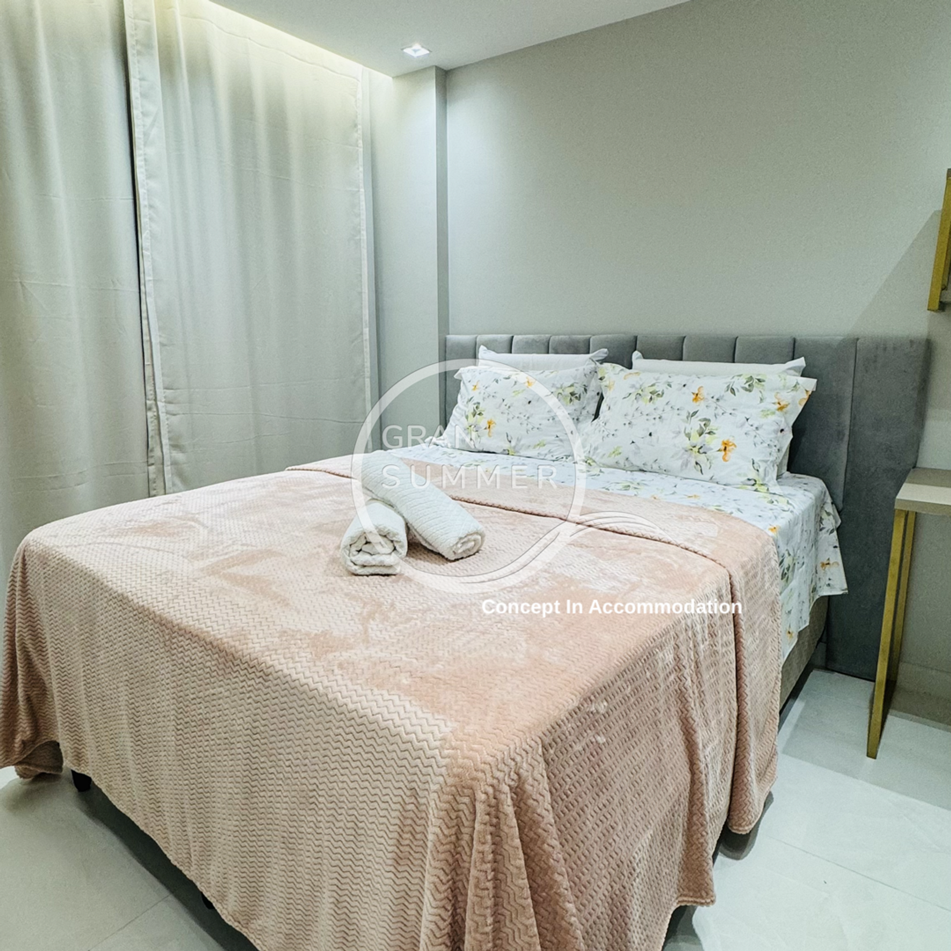 Apartamento completo, equipado com cozinha e utensílios,01 QUARTO, 01 cama de casal, armário para roupa, 02 centrais de ar condicionado, espaço para refeições,01 banheiro, lençóis 400 fios para maior conforto na hora do descanso dos nossos hóspedes, nossas Smart tv's com qualidade 4K e telas 43'' e 65'', 01 sofá-cama, 01 geladeira, 01 fogão, 1 micro-ondas, armários de cozinha, mercadinho 24h. Acomoda até 04 pessoas.
