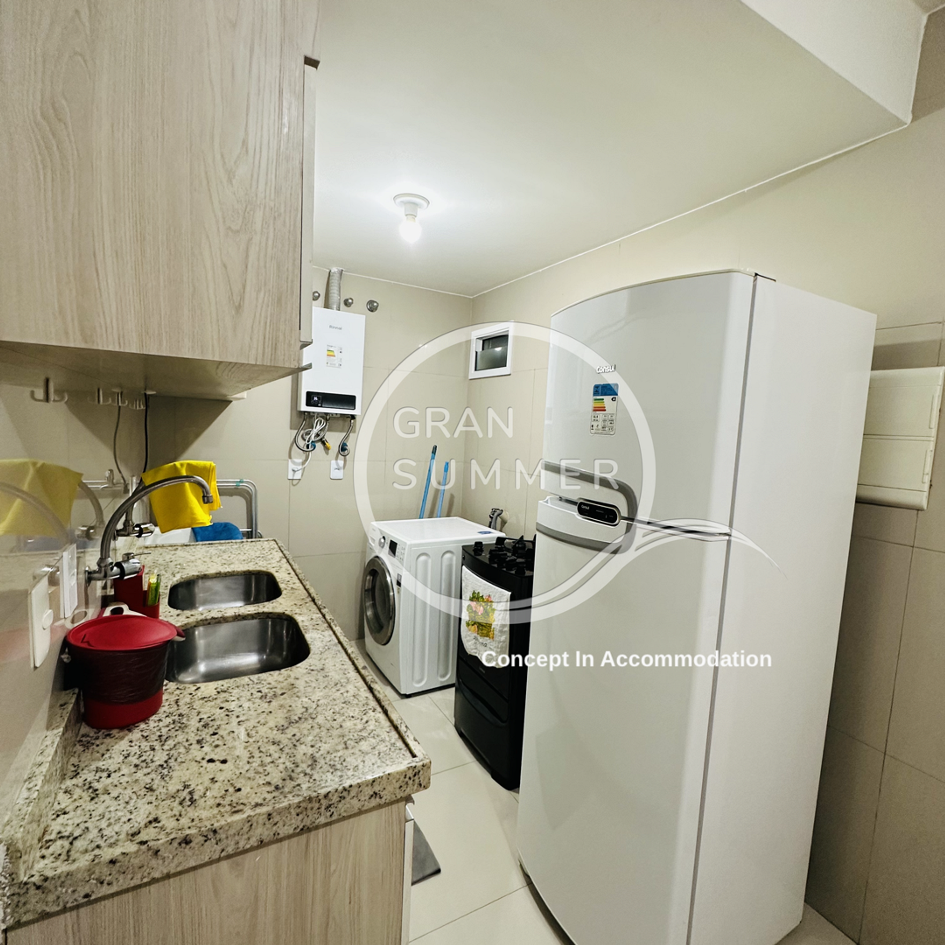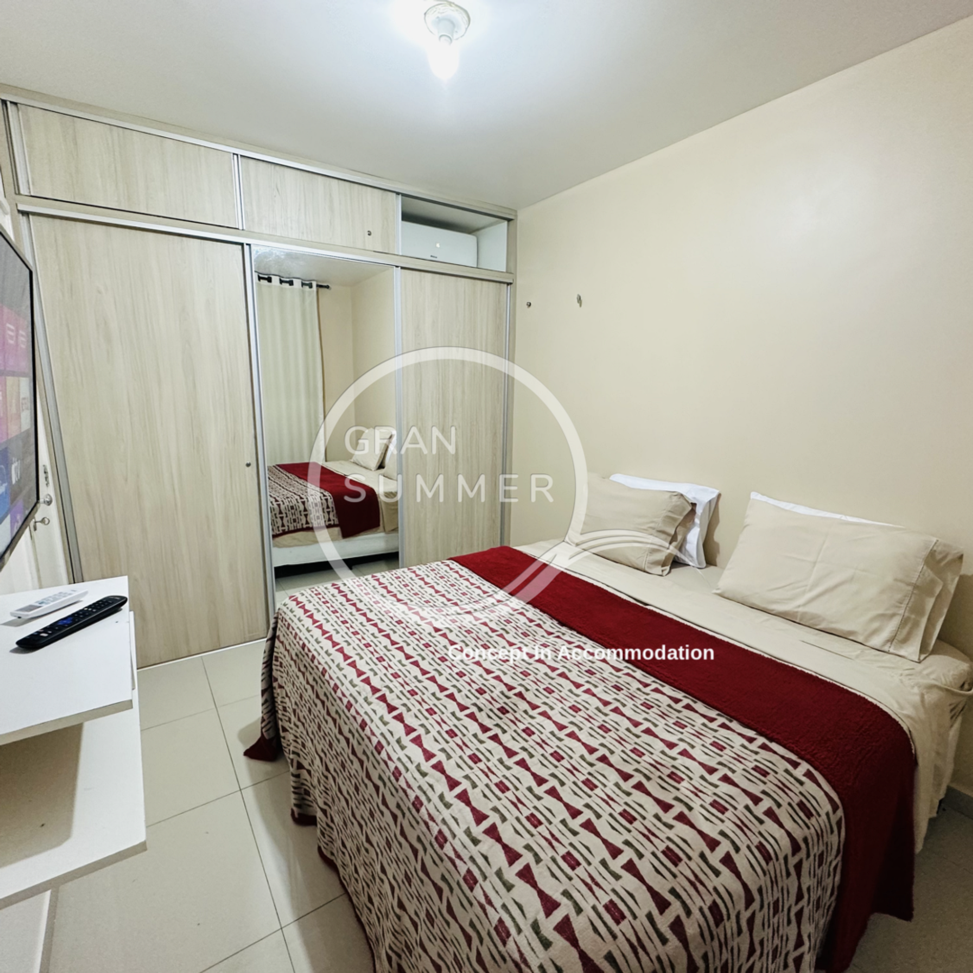 Apartamento completo, equipado com cozinha e utensílios,02 QUARTOS, formatos com 02 camas de casal, ou 01 cama de casal e 02 camas de solteiro, 01 armário para roupa, 02 centrais de ar condicionado, lençóis 400 fios para maior conforto na hora do descanso dos nossos hóspedes, nossas Smart tv's com qualidade 4K e telas 43'' e 60'', 01 sofá cama, 01 mesa para refeições, 04 cadeiras, 01 geladeira, 01 fogão, armários de cozinha, 01 micro-ondas, 02 banheiros., mercadinho 24h. Acomoda até 06 pessoas.