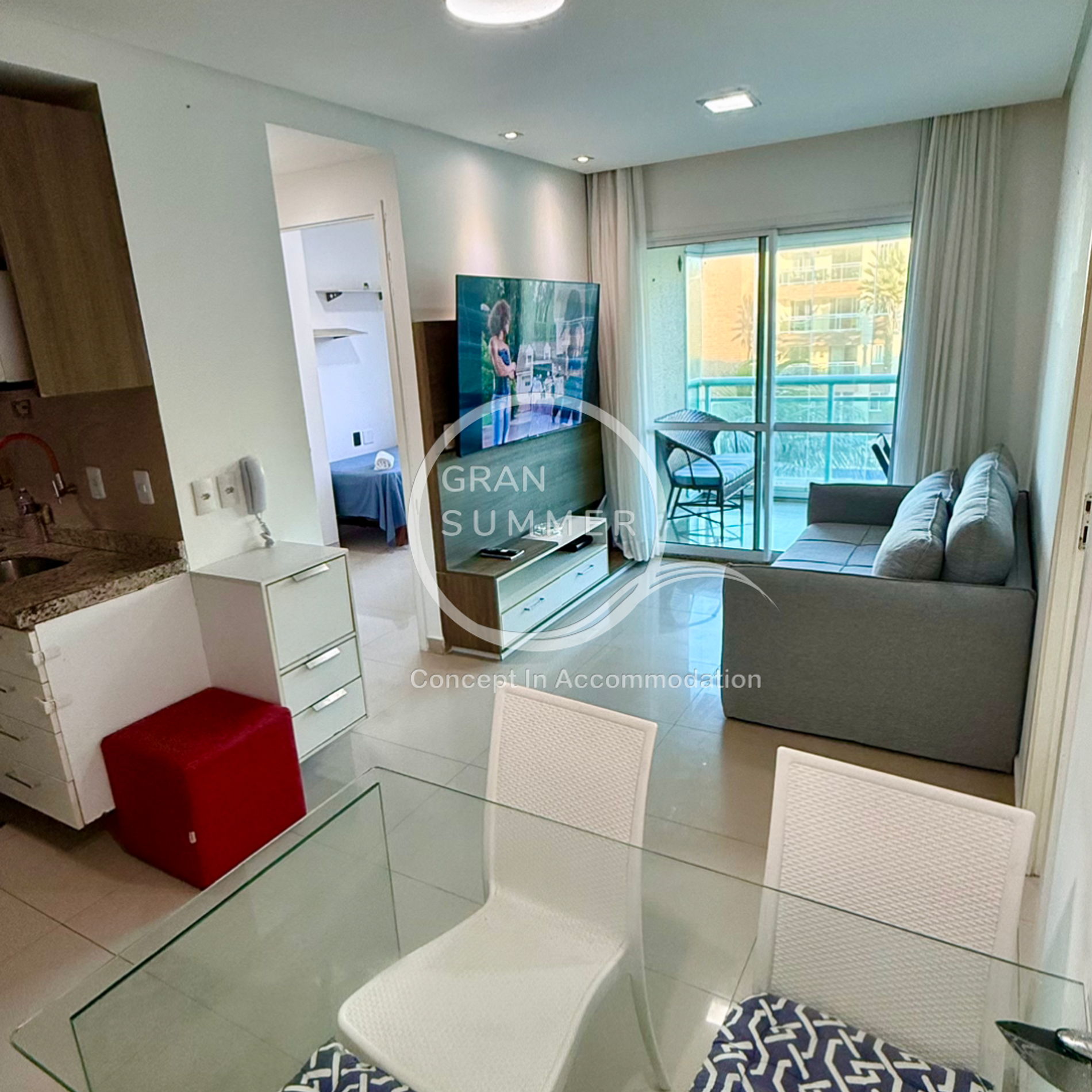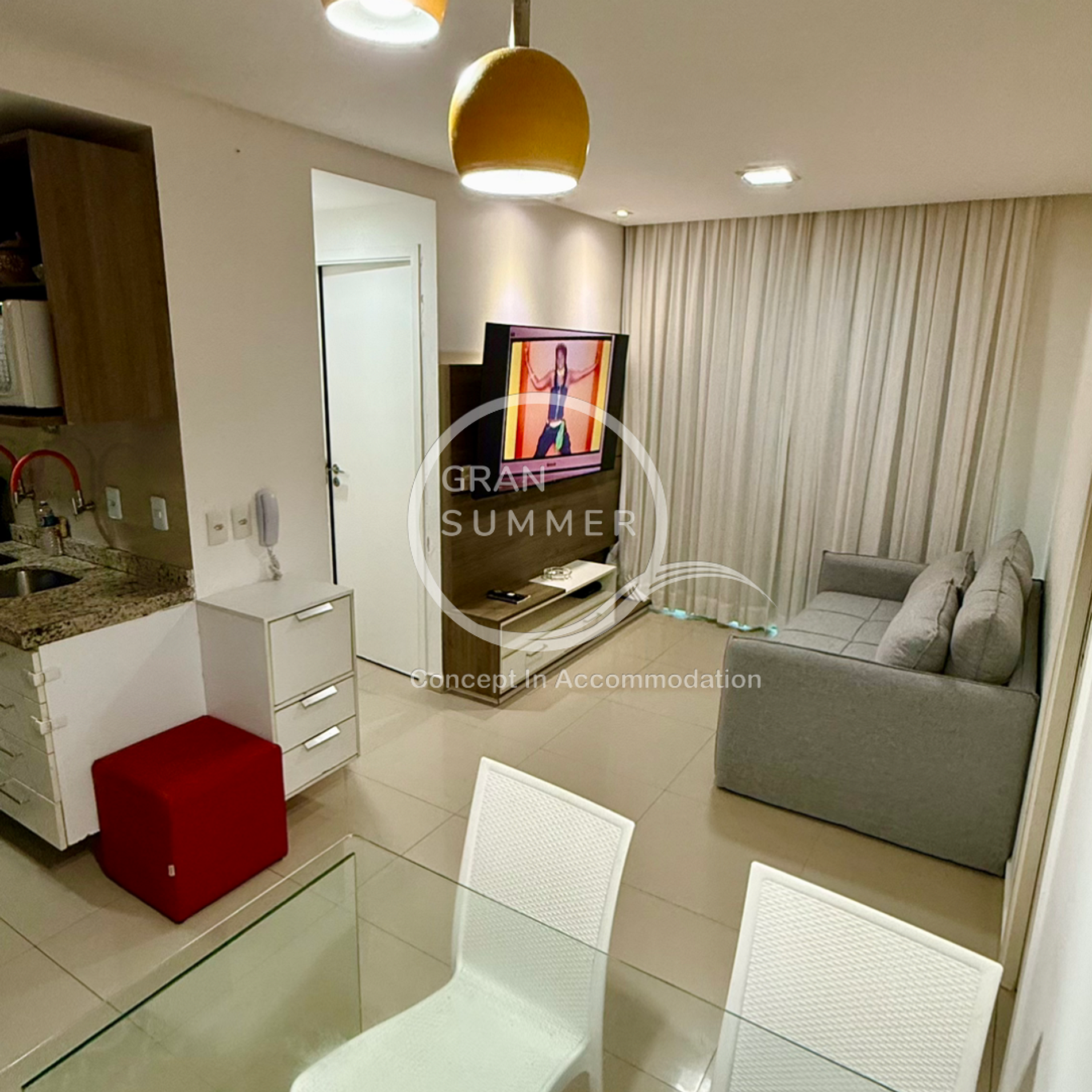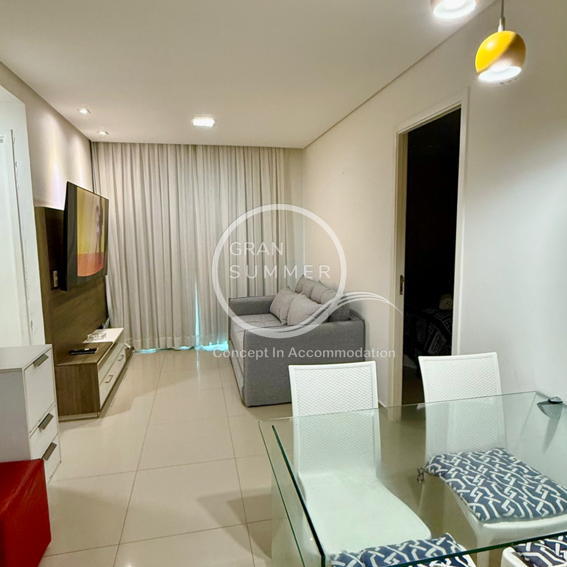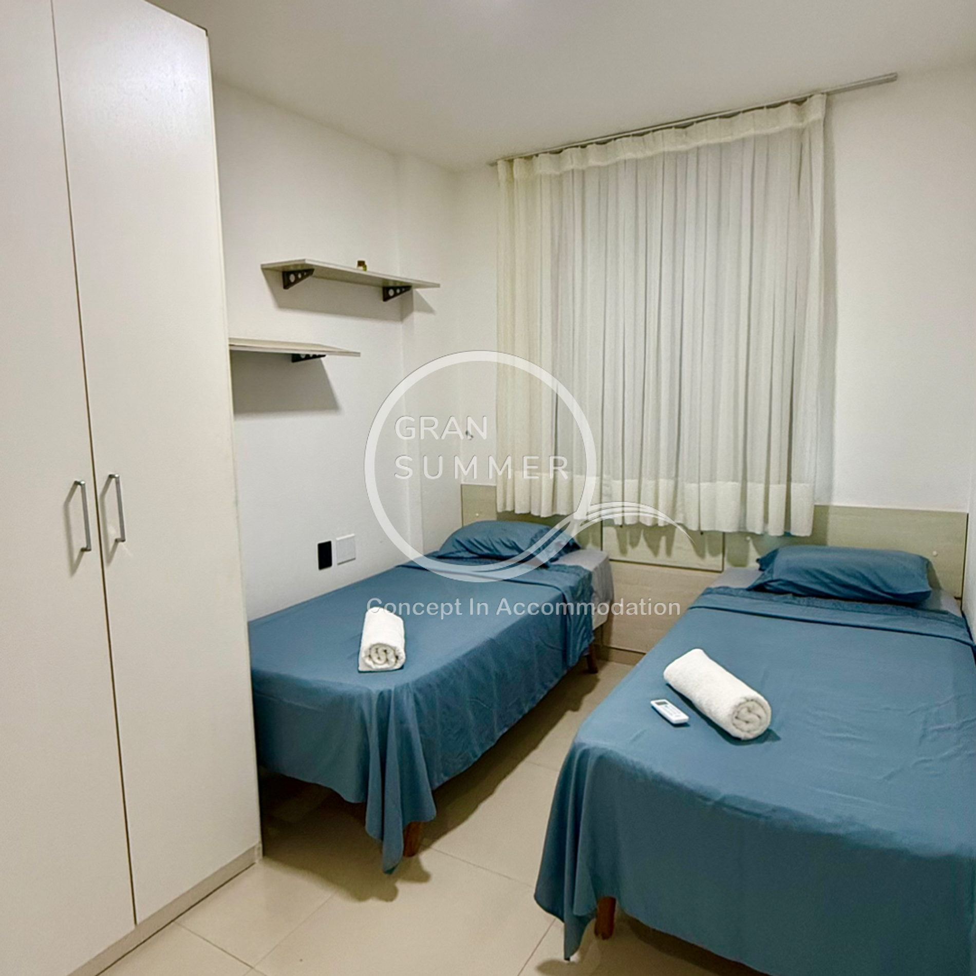 Apartamento completo, com cozinha e utensílios, 02 QUARTOS, formatos com 01 cama queen, e 02 camas de solteiro, 01 armário para roupa, 02 centrais de ar condicionado, lençóis 400 fios para maior conforto na hora do descanso dos nossos hóspedes, nossas Smart tv's com qualidade 4K e telas 43'' e 65'', 01 sofá cama, 01 mesa para refeições, 04 cadeiras, 01 geladeira, 01 fogão, armários de cozinha, 01 micro-ondas, 02 banheiros, mercadinho 24h. Piscina adulta interditada até 15/12/2025..