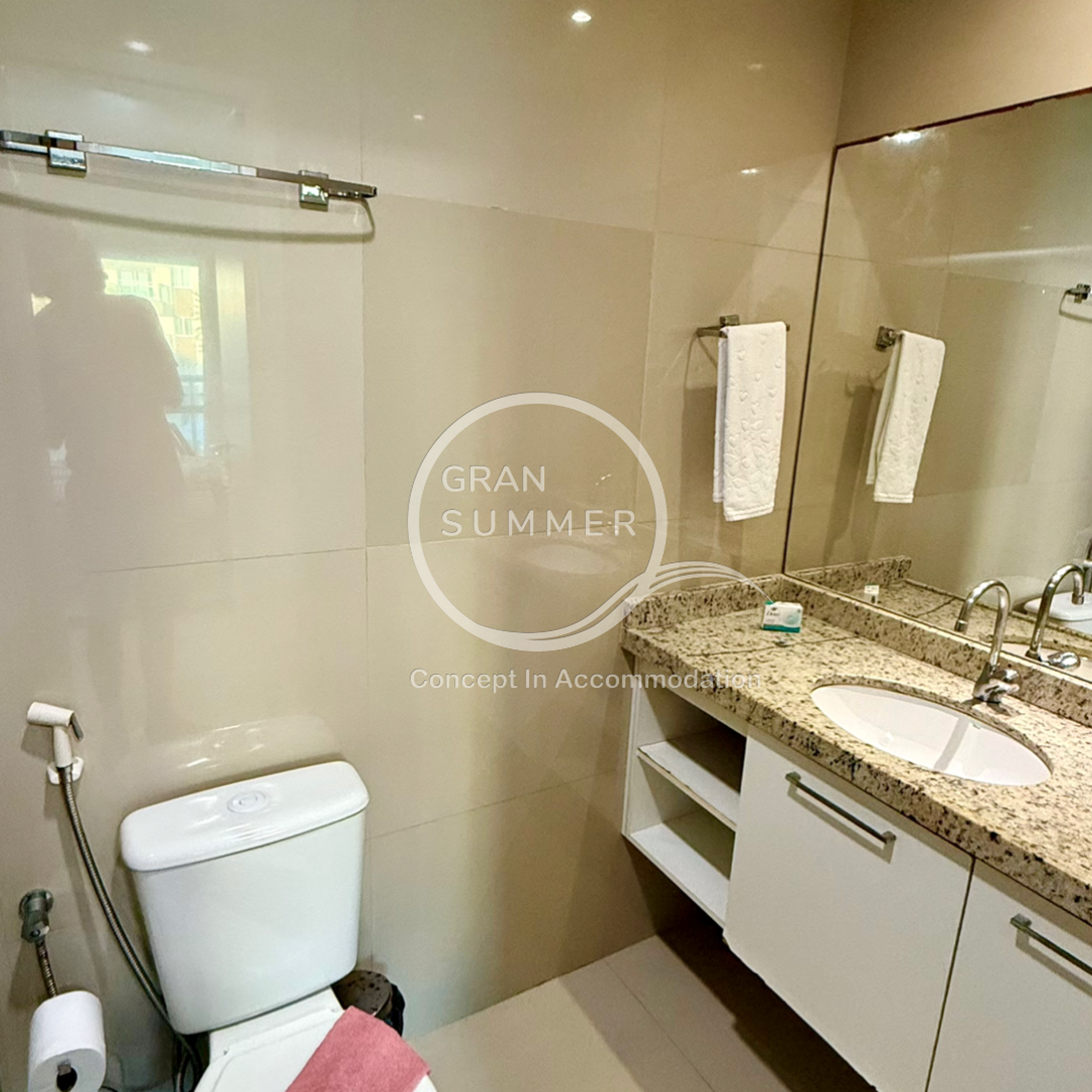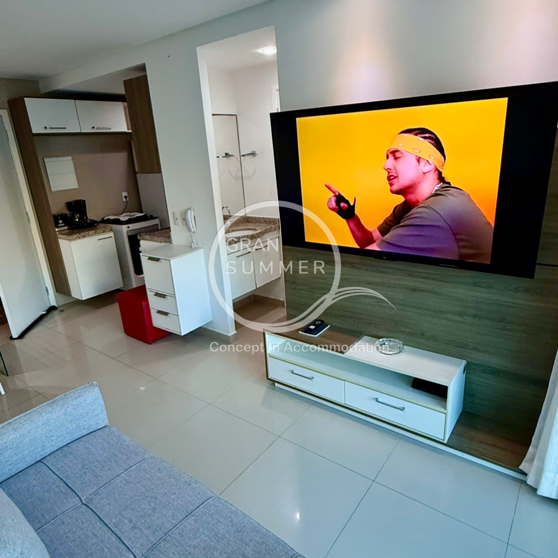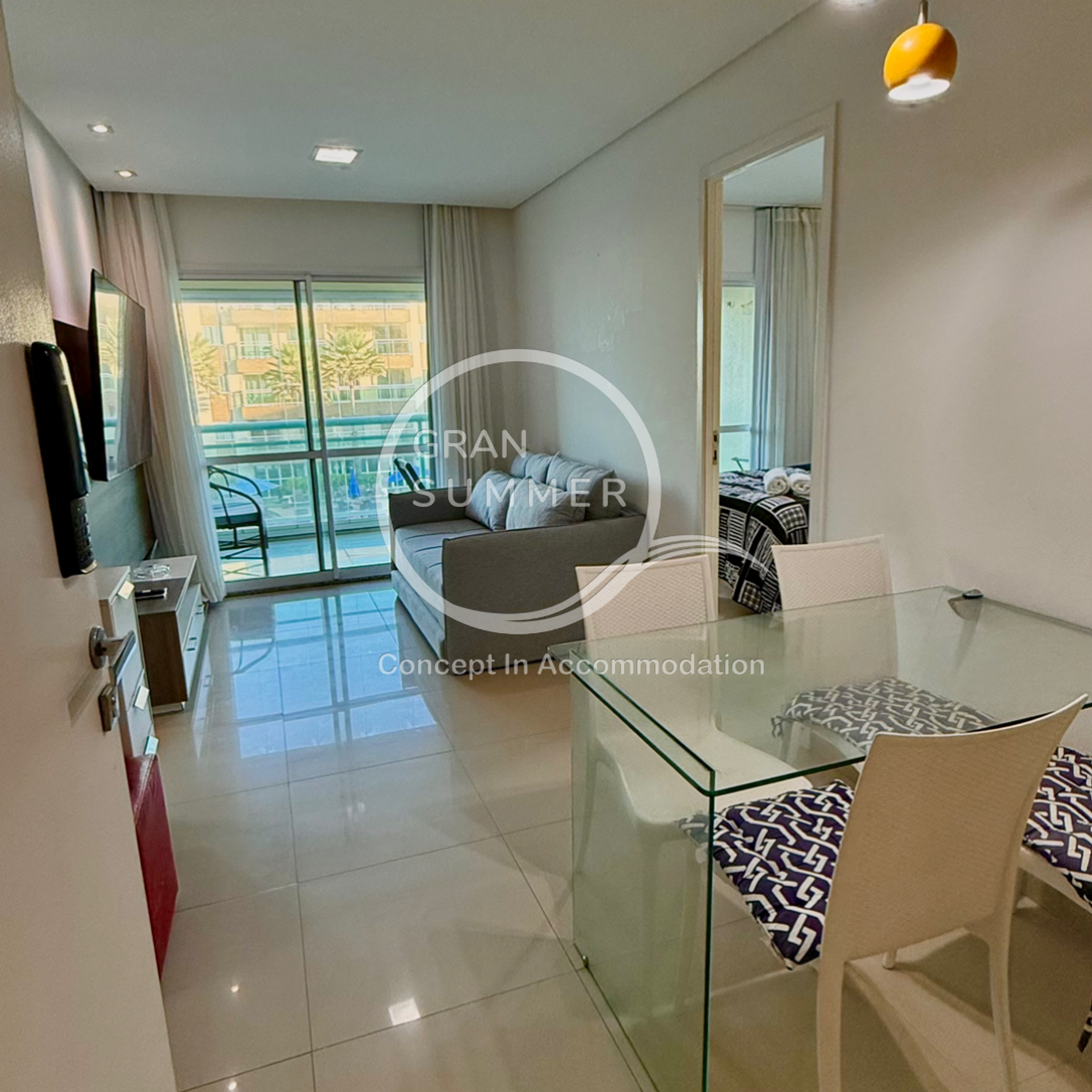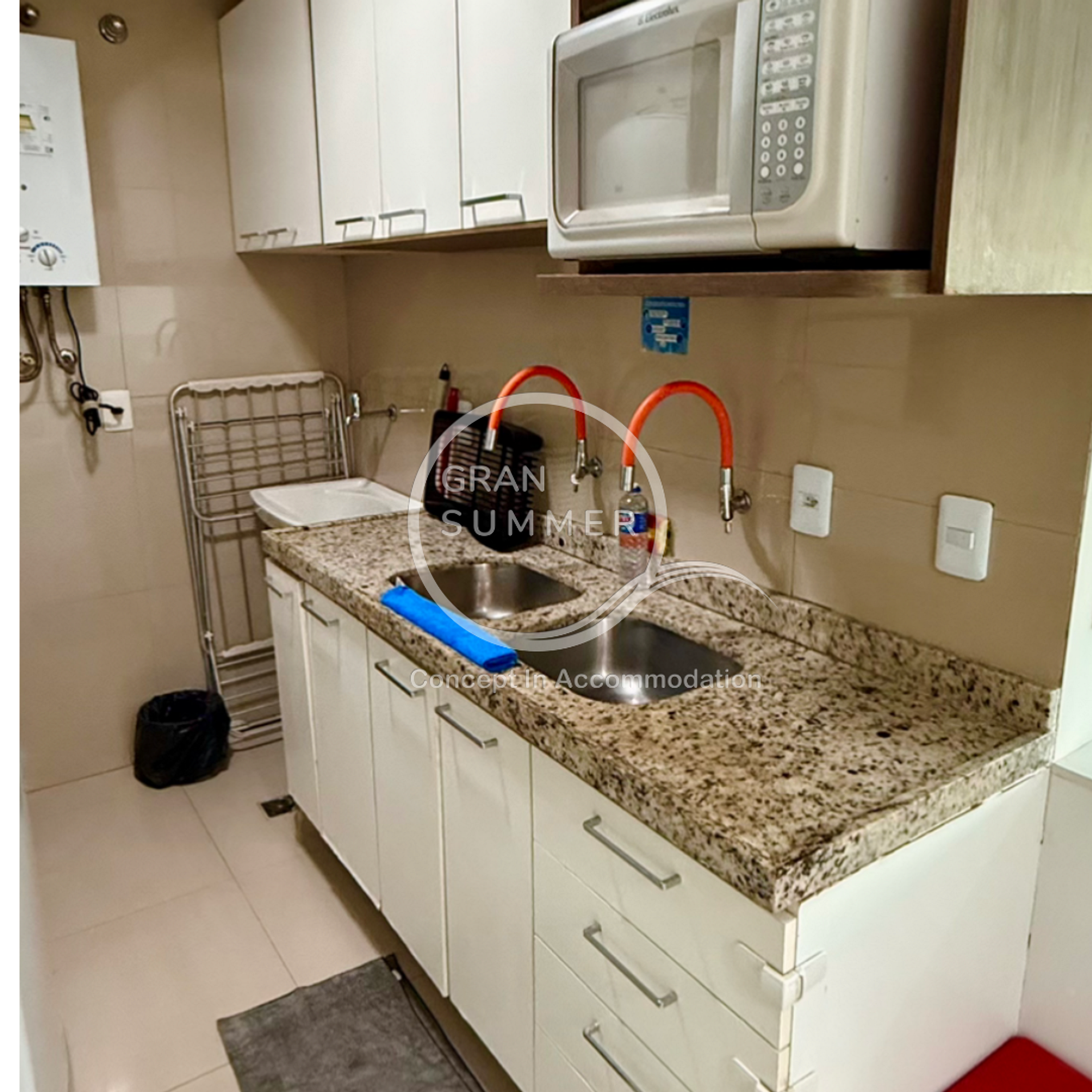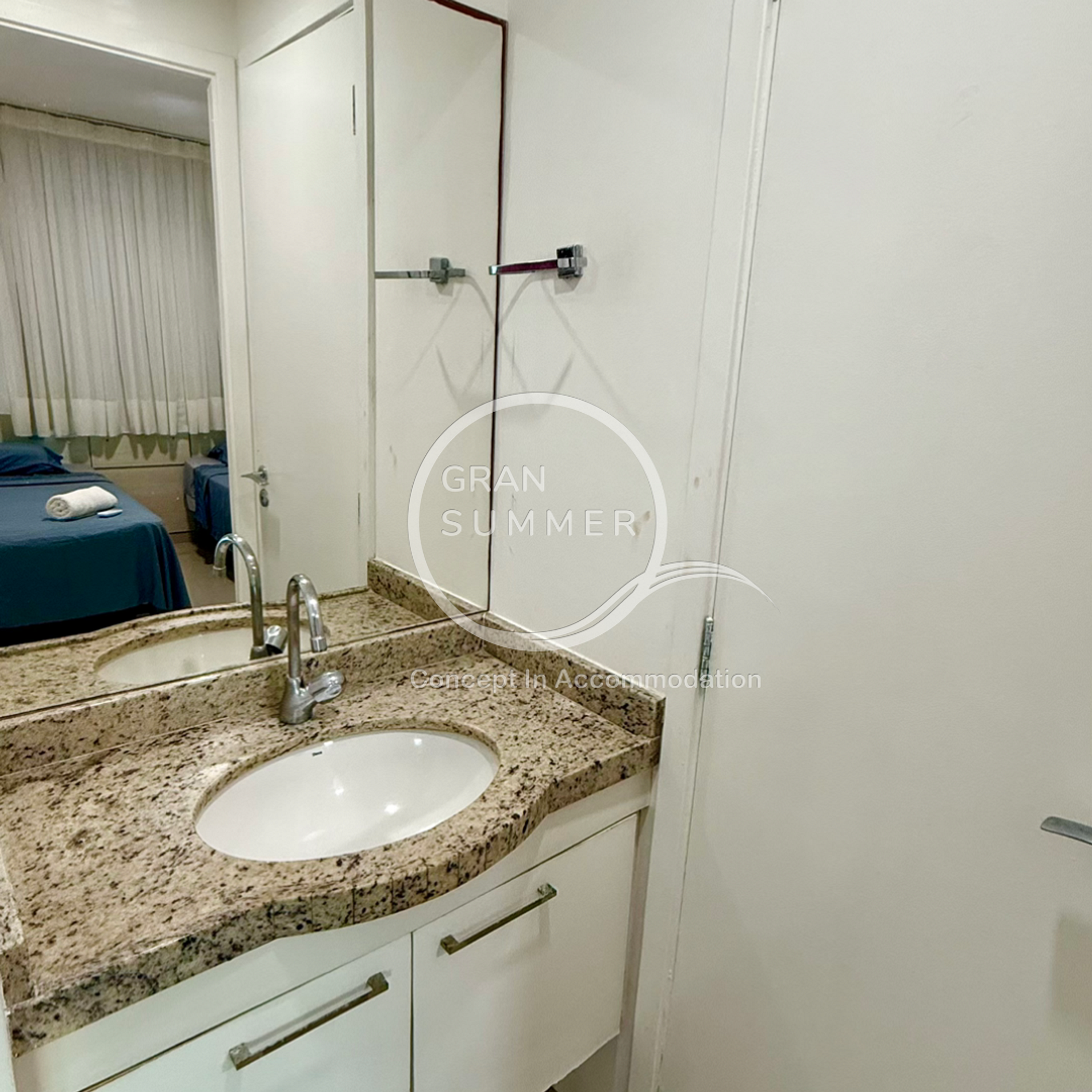 Apartamento completo, com cozinha e utensílios, 02 QUARTOS, formatos com 01 cama queen, e 02 camas de solteiro, 01 armário para roupa, 02 centrais de ar condicionado, lençóis 400 fios para maior conforto na hora do descanso dos nossos hóspedes, nossas Smart tv's com qualidade 4K e telas 43'' e 65'', 01 sofá cama, 01 mesa para refeições, 04 cadeiras, 01 geladeira, 01 fogão, armários de cozinha, 01 micro-ondas, 02 banheiros, mercadinho 24h. Piscina adulta interditada até 15/12/2025..