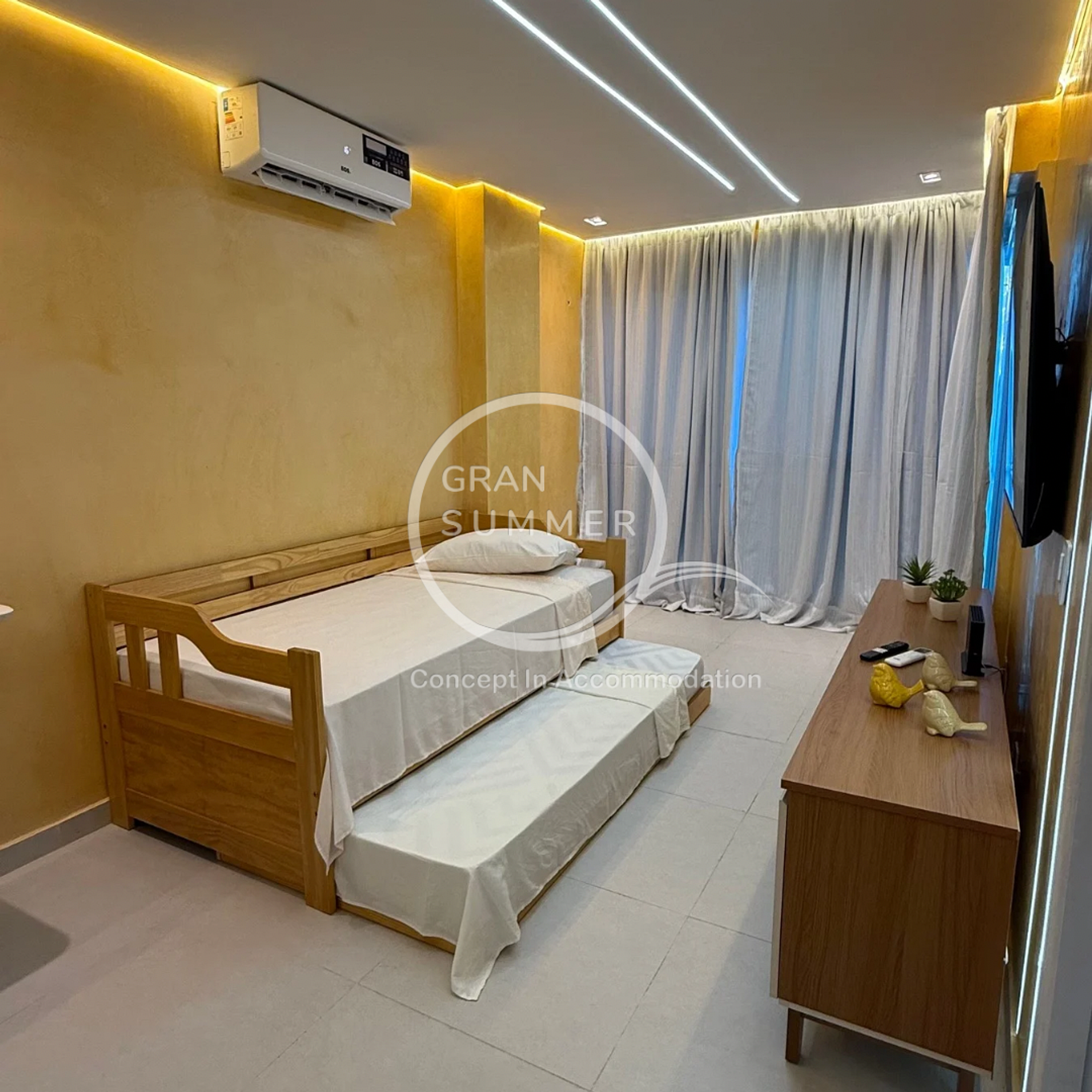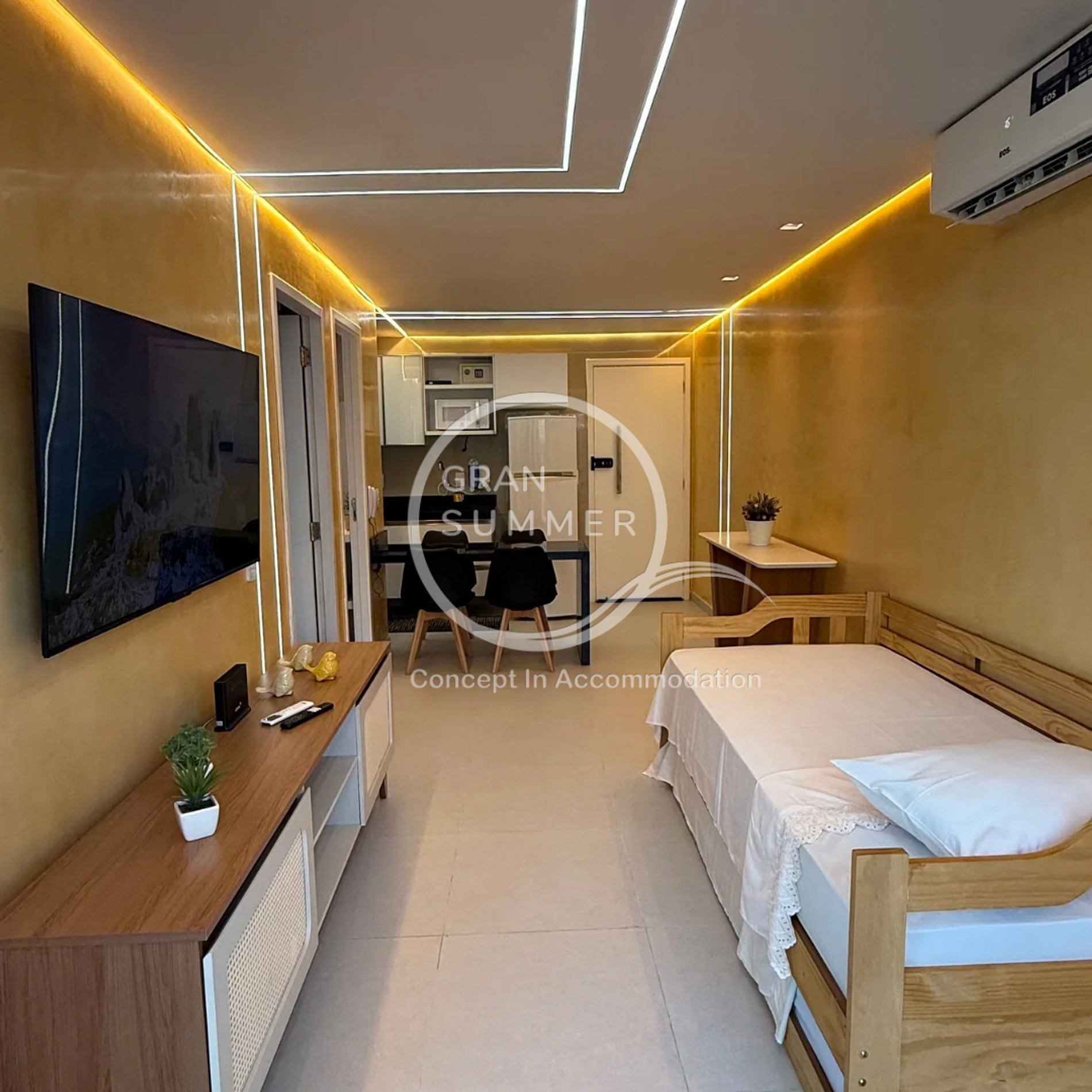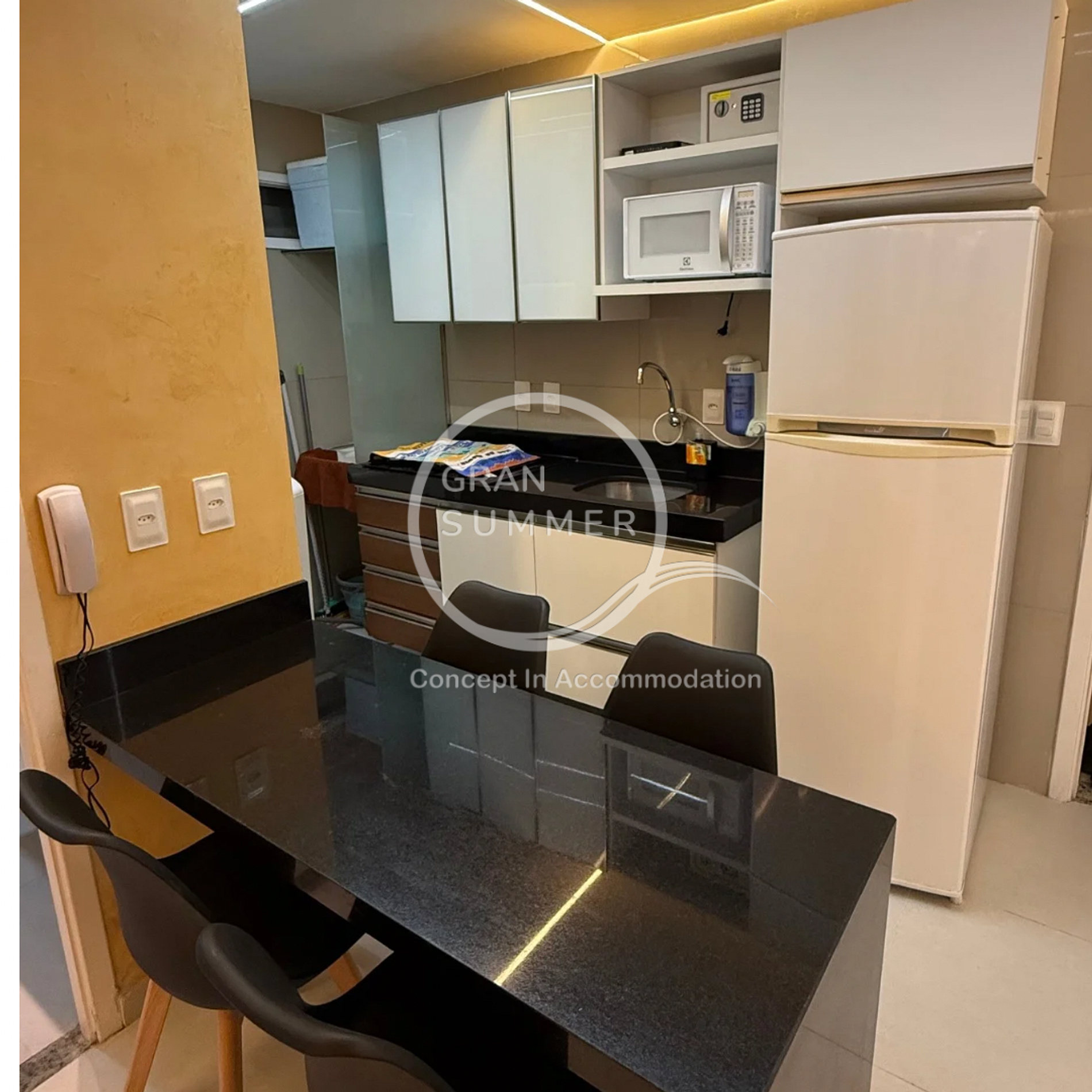 Apartamento completo, equipado com cozinha e utensílios, 01 QUARTO, 01 cama Queen, armário para roupa, 02 centrais de ar condicionado, espaço para refeições,01 banheiro, lençóis 400 fios para maior conforto na hora do descanso dos nossos hóspedes, nossas Smart tv's com qualidade 4K e telas 43'' e 50'', 01 Bicama, 01 geladeira, 01 fogão, 01 micro-ondas, 01 máquina de lavar, armários de cozinha, mercadinho 24h. Acomoda até 04 pessoas.