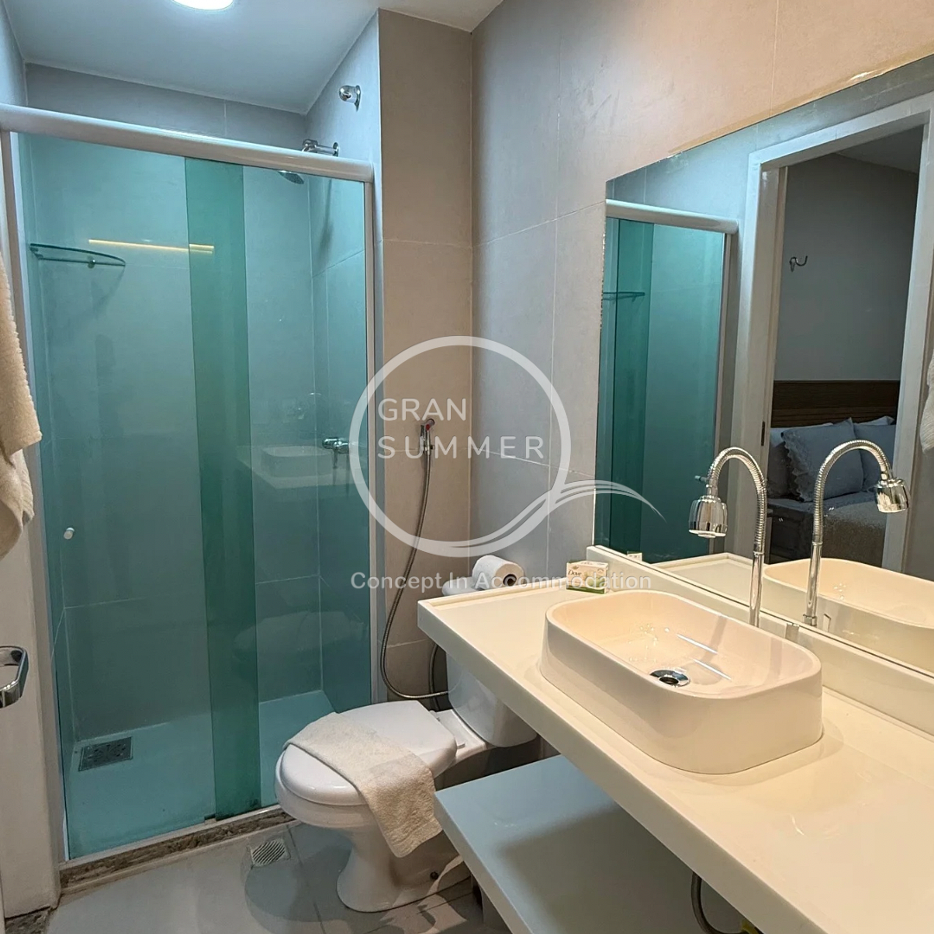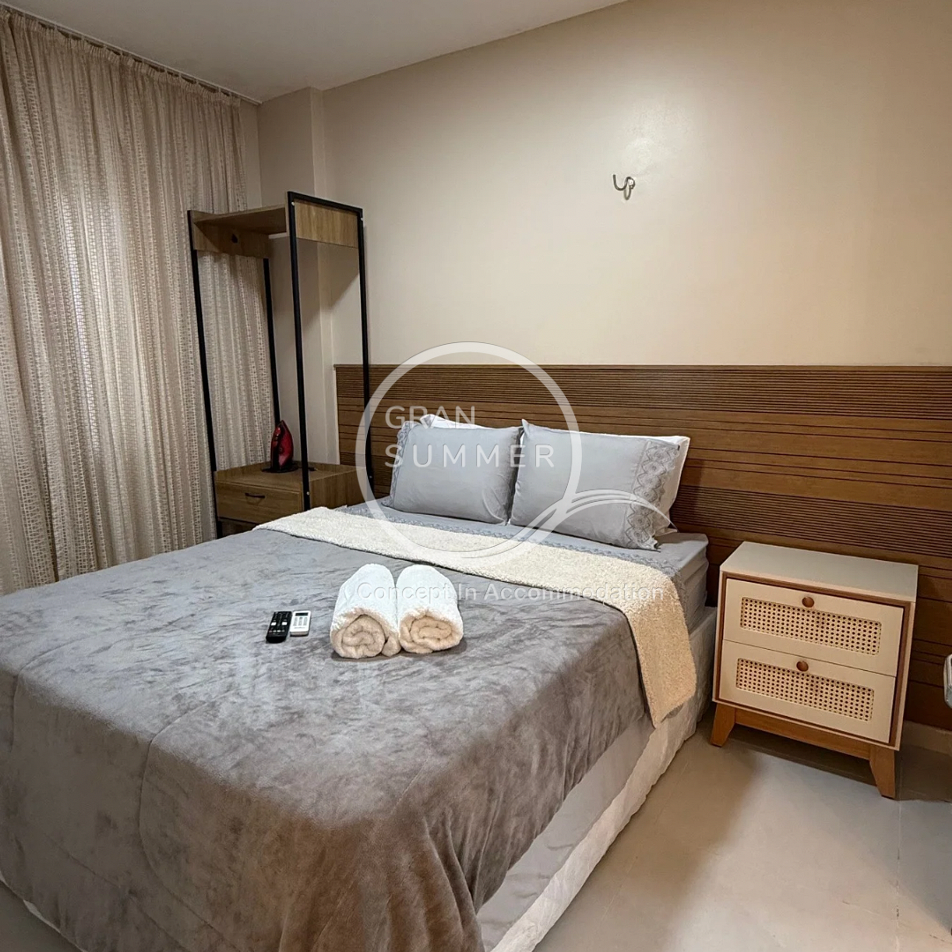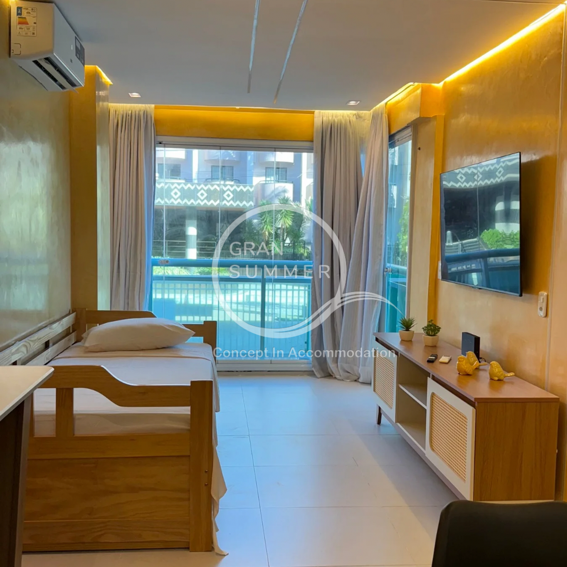 Apartamento completo, equipado com cozinha e utensílios, 01 QUARTO, 01 cama Queen, armário para roupa, 02 centrais de ar condicionado, espaço para refeições,01 banheiro, lençóis 400 fios para maior conforto na hora do descanso dos nossos hóspedes, nossas Smart tv's com qualidade 4K e telas 43'' e 50'', 01 Bicama, 01 geladeira, 01 fogão, 01 micro-ondas, 01 máquina de lavar, armários de cozinha, mercadinho 24h. Acomoda até 04 pessoas.
